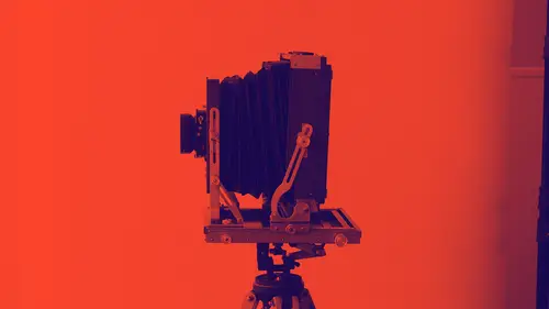 happen when you get your film, though, is it's gonna come in kind of a cool box. It's a box, you're gonna open it up, there's gonna be a box inside a box. Now, this is already exposed film, so I can show you what it was, it was expired film, and then, inside there will be a package. Inside the package will be your film. You have to deal with this box and everything in the complete darkness. So if you've got an internal bathroom, you put a towel under the door, but you need to be in the complete dark. You're gonna take out a sheet of film. I'll do it on eight by 10, 'cause it's larger. One of these has a secret sheet of film in it. Okay, here's the sheet of film. This piece right here is called the dark slide. It keeps the film from being exposed. The film, you're gonna wanna put in your right hand, and the notch is gonna go, if you're gonna do it horizontally, you're gonna load the film this way, the notch goes in the lower right hand corner. If you're gonna load the film in portrait, it goes in the upper right hand corner. You want that notch to be in your right hand. What that does is make sure that the emulsion is gonna face the right direction, so the part that actually exposes on the film. This little flap's gonna open, and inside the film is gonna be these little slots you're gonna go under, and what you're gonna do is the dark slide's on the top slot, and you're gonna take the film, and you're just gonna slide it into the bottom slot, and then it's gonna push all the way to the back, you're gonna close the flap, and then close the dark slide. You wanna make sure when the film is unexposed that the white part is facing out. When you look at the dark slide, there's also a black side. When the film's exposed, we turn the dark slide around, and then that tells us that the film's exposed. So basically, you're gonna load one side with the film, you're gonna flip it over, and you're gonna do the same thing on the other side. What I recommend you do is just get a piece of film, and you're just gonna practice over and over again, because it's gonna be in the dark, and so basically you're just gonna have to get used to that feel. If, for some reason, it's not going under that slot, the easiest thing to do is just kind relax for a second, 'cause you don't want your hands to get really sweaty, or you're gonna end up with fingerprints on your film. So you want really dry hands, you wanna stay nice and calm. And the other piece is if for some reason the dark slide doesn't go back in, that usually means that you're in the upper track, so then just back the dark slide off a little bit and try to reload the film agan. Close down, and it'll close up like that. So, the loading the film is, it just takes a little bit of practice, but once you've done it literally about two or three times, it goes by really quick. There's a couple of other types of film you can use. One of is a, it's, in the old days, you could still get some Polaroid film, but not much. But there's a film called New Type 55, and it has a special holder like this. So you don't, this film comes on a sheet, you basically just stick it in here and pull it out, so you don't actually use film holders like this. But this is an option. It is not cheap. One of the great parts is you get a Polaroid plus the negative to actually process in the darkroom, so this is another option for types of films that are available. Not cheap, but a really nice way to go. They also, this company also makes something called a quick load, which works with this holder. The film is in a dust light type container already, so you don't need film holders for that. But again, it's not as cheap as using regular film. Couple of things if you're gonna be loading film. I recommend if you look on this film holder here, let me get one that's a little easier to see. You can see I have 413, hopefully, or you can see I have a 0201. This side says 414. You wanna label each side of your film holders, because if the film holder has a light leak and causes a problem, you'll know which one it was coming out of. And also, you need to record your exposure, so you know actually what the settings were, so you can tell the lab either how to process the color, or you can tell yourself, if you're developing your own film, whether you pushed or pulled the film, or what kind of processing that needs to happen.