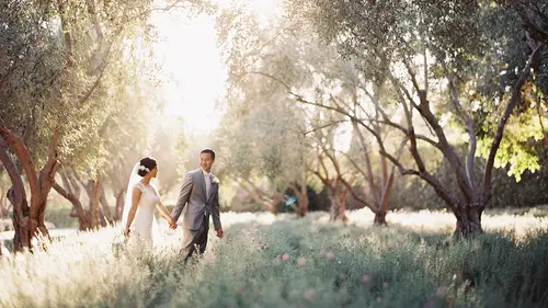again, it's two very different looks, right? But that's the difference between front lighting an image versus backlighting an image. And so, I think the look that I'm known for at least is that soft and airy, romantic look, and so if that's what you're going for then you wanna try to backlight your clients as much as possible. But there are situations where, let's say, during a ceremony, you can't say, "Oh, can you pick up this wedding "arch, and move it over here?" Although, I sometimes do wish I could say that, but sometimes, that's where the arch is. That's where they're gonna get married in. You gotta shoot it that way, right? So let's jump into that first and see how can we trouble shoot when you have to front light an image? So both of these were front lit images, and again, it's because the client was like, "I really want a picture with that statue." (laughter) And so, it's like alright, well, the good thing for me was at least it's front lit, completely front lit. I think side light in this kind of situation is even harder, because that's where you're gonna get shadows in the face. So for me, my goal was how can I get them the most evenly lit in this high noon situation that I can? And so some of the common challenges that you will face when you're front lighting your subjects is squinting. How many of you during family portraits where the father or the uncle, usually that's who it is, when I'm backlighting them is like, "Well, why are you shooting it this way?" "It's gonna end up being really dark." "Don't you wanna face the sun instead?" Anyone have that? They question you why you're, and it's because their iPhones can't, or they don't know how to expose their iPhone for the shadows and so they're getting silhouettes. So they want to face the sun instead, right? It's like, okay well, if you face the sun you're gonna deal with squinting. Sometimes you gotta do that. In this situation, I was trying it out, because we got them on a rooftop in downtown LA. And this I tried front lighting and then I tried backlighting them. So you can see there's a difference. The backlighting, the sky is washed out. I liked this, because it was a very clean backdrop, so I wanted both, right? But I also wanted them to remember the rooftop that they got married on, so I also needed to front light them as well. But of course, you can imagine, them standing there in bright sun into their eyes, right? So one of the tricks that I use to help with the squinting is I just tell them to close their eyes. Just keep your eyes closed, as I'm figuring out my settings, and bridesmaid number three, can you step a little to the left? To the right? As I'm getting them in that position, I just have them keep their eyes shut or look on the floor. And then, it's like alright, everyone eyes shut, and then on three, one, two, three. And then they open their eyes, I get the quick shot and then done. I think that's an easy way to ensure that you get all their eyes and they're not. I tear if I look at the sun, anyone else? I don't want anyone to deal with that, especially if they have makeup on. Yeah, so then this was a backlighting option and I think that was more comfortable for them. So I have both. The other thing is what you mentioned, is you're gonna have shadows, so depending on where the sun is coming from you're gonna get all these shadows. For example, with this one, I had her tilt her head up a little bit into the light more. And then that brought her face into the light and not getting the shadows in places. I don't want the shadows. I'm trying to avoid the shadows here and from the nose, so when they just tilt up a little bit that makes it so that the light's not falling down, casting a shadow here. Like if I could redo this, I would probably have her look that way, turn into the light more. Then this side of her face wouldn't be shaded. But I remember thinking I didn't wanna do that for compositional reasons. I didn't want her looking out of the frame, so that's why I didn't do that. So I made a choice at that moment to keep her, but I think she adjusted slightly for that and that helped a little bit. So the other kind of light, my favorite kind of light is backlighting. This is where the sun is coming literally right at you. And often times I do see sun spots after I'm done shooting this, 'cause the sun's coming right into your lens. If you look right at it, it's really bright. I wanna give you some tips to avoid that. But there's also several other tips that I think will help really create images like this. How many of you have tried to take a picture like this with your iPhone? How does it look? Anyone wanna? Does it give you a silhouette instead? Yeah. And this is exactly what I was talking about like the uncle or the dad that's like, "Oh, why are you shooting this direction? "The couple's gonna look all black." And I was like, "Well, it's 'cause "you're doing it on your iPhone, "and your iPhone is trying to expose for the sky. "And that's why you're getting a silhouette instead." So when you're shooting backlight, the number one thing you have to do is meter for the shadows, so shoot in manual mode. If you need to walk up really close to the couple, meter for them, and then back up and use that same setting. You wanna meter for the shadow. Otherwise, you're gonna create a silhouette. Unless that's what you're trying to do. This was a silhouette image I created back in or something like that, but I still love it just 'cause they look like two little birds to me. So this is an image that was metered for the highlights, and not the shadows. But also a backlit image, so unless you're trying to go, so you have to ask yourself are you trying to create a silhouette? Or are you trying to light them up? That's where you either meter for the shadows or meter for the highlights. The other challenge you're gonna face with backlighting is flare, so depending on where it comes into your lens, it is gonna cause some haz