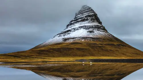 mmetry and architectural buildings this is ah lighthouse along the coast that I saw beauty in those triangular shapes of snow then I'm in aa place having ah sandwich it's snowing outside and I'm doing the interior abstract then a completely abstract shot this is the twilight sun reflecting on a window at old house and it became apparent to me the scratches the beautiful lines are dogs clause so that dog has gotten up there on his back and the witness and warmth of his nose has melted the snow and you see the scratch but it becomes a complete abstract so I never saw the dog but that's pretty evident what happened then there's the again the urban scapes I'm trying to convey in a different way so you know long shot of a highway a bus coming my way honking I'm getting those last shots before uh passes I get within a waterfall iceland's known for a water fault you know it's rain so much on the interior island is like bleeding water out to the seas and so the waterfalls are great subjects not just a typical shot from a distance I'm trying to get in and abstract the waterfall I have no interest and shooting a water follow that somebody says oh yeah I know what one that one is I'd rather just play with elements because again and again and again it's about texture, pattern and shape so the texture of the water is when I'm playing with I'm getting under the waterfall playing with the way the light falls on it then that lingering miss that rises from the water paul is really the basis of this image with wet glass of grass and just tendrils of water floating in the air yeah, I got wet during this shot but it's unusual view of moisture on grass backlit so I am occasionally taking workshops up their teaching composition I've got an assistant so we love playing in the myriad of waterfalls and rivers that laced through iceland so foreground elements background water leading lines this is all part of the dialogue and the way we see things so in this particular case leading line would be that crack in the rock it's pointing you right up to the waterfall in the distance in this particular case the crack in the rock is leading you to the person beyond so we're playing and having fun with compositions in this particular case the waterfalls leeching out from under a lava field and lava and volcanic history is a big part of the story of iceland it was foreign by various volcanic eruptions so you have these really strange waterfalls coming out of a lot of field surrounded by moss but this is a little more interesting to get six feet beyond finding, you know a myriad of flowers that bloom during the month of july that becomes an interesting foreground. The waterfall becomes secondary to the flowers and then the fact that this is a cold, moist environment means that there's a lot of moss a lot of uh lycans a luxuriant environment from a ground vegetation point of view and so that becomes the subject you know, this is a completely different environment than what you'd find in the american southwest or the northwest forest by this justus val is just is interesting. The reddish rock in the distance is part of the volcanic history. Oxidized iron, the yellow green of the, uh moss stands nice against the red rock complementary colors of red and green work together, and then the foreground rocks air just laden with these really thick carpets. Amoss so this is an environment worthy of shooting than I even go deeper. And with the seven to two hundred extension tube's shooting my mac rose of just the moss in the lycans, and then maybe the elements of grass, linear quality of the grass punctuated by a buttercup so simple, clean uh, abstracts are great for the mind and then put on the wide angle and shoot the bigger stories. The coastline is dramatic again it's, a volcanic island that's being added to constantly with love of flows so that vertical nature of a very new land, you know, the older mountains become rounded hills. But if it's brand new it is made within the last hundred years or so there's very little erosion. So you've got the's no vertical mountains right at the water's edge this was noted earlier is an eye you see the eye and it's amazing and I thought all right everybody knows about this I so I went to the nearby village and I said tell me about the eye and they go what are you drinking I said there's a nigh on the mountain and they said we've never seen it and probably true just a small layer of fresh snow was just enough to highlight what looks like an eye and if there's no snow you don't see if there's too much so you don't see it but it was definitely there on that morning and there was two wolper swan's that we're on the edge of lake I walked over to photograph him and they took off and as they flew under the a mountain I got the shot so I love the symmetry of this the eye adds to it the reflection adds to the two white birds as a point of scale add to it but nobody in the village about a one mile away have any idea what I was talking about okay one of the mohr interesting areas of iceland is on the south coast it's a very large lagoon freshwater late fed by three very large glaciers and these glaciers are capping icebergs so you have the element of a lake with icebergs have mountain backdrop and then you're within a half a mile of the ocean this is a recipe for drama and for really great subjects I've been there many times no two days are alike is constantly changing if you're there at high tide it's slack tight so isis just floating with beautiful reflections and then a zeiss ahs the water drops again influenced by the proximity of the ocean I starts moving so you've got this changing elements elements of ice changing in the landscape so these two icebergs you can see our beautiful color it's a foreground element and then as I stay with them later in the day, they really provide a different color and a the atmospheric conditions as the sun is getting low and eventually after sunset there's still that wa