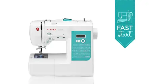 rs use the machine and have to put it away it's a great place to store it if you have to ever send it for anyway warranty work or ship it anywhere for like service the best place to do that isn't something that fits perfectly so we really encourage you to hang on to the box if you can so I wanted to just call that to your attention ok? And so what comes with your machine once you do take it out of the box you have a few items that are in a plastic sleeve in inside the packaging and one of those of course is your instruction manual and I would encourage you even if you already own the machine and you haven't yet done this I would encourage you to really read your manual from cover to cover there's a lot of very good information in here, much of which I'm going to cover today and show you but find very often that folks don't really make that good use of their manuals and there's a lot of good information in here, so do yourself a favor and read that and then you also get a machine dust cover and if you do are one of those folks that leaves your machine out and you sofa rather frequently this is a nice little dust cover that just fits perfectly over the top it's got a little slot in the top two for if you just want to transport it, remove it from the table temporarily but it fits it beautifully so that keeps the, um dust and lint out of thie open areas that the machines so that those don't get full of um, dust, and you just have to clean the machine out more frequently, and then the other thing you get is some information about the warranty centers and where those are, and some just information about getting into contact with singer and then the last thing, this is what we call our quick start guide, and I think you'll find this quite helpful. It really is information very, very clearly spelled out for you how to not only wind and insert a bobbin, but also how to thread the top of the machine. And this is something you might even just keep handy and maybe the top drawer of your sewing table or just keep handy for a quick reference. So I wanted to call those items to your attention. Those are in your box, so we'll go ahead and get started. I'm going to just give you a little tour of the machine. So up here at the top, as I mentioned there's that carry handle used for transporting your machine, and up here you have the bob and winding spindle and bob and winding stopper, and you'll see those in action very shortly. Over here on the side is my hand wheel, we always turn the hand well toward us, not away from us hand wheel over here, this is what moves the needle up and down um it moves up and down when you're so into that if you want to manually move the needle up and down you use the hand well to do that this is your tension control these are thread guides for threading and I'll show you the wining a bobbin and threading the machine shortly so and there's died there are diagrams at the top of your machine that show you exactly where to put the threat for doing both the bobbin and the upper thread you have a take up lever right here going to talk about that this machine has a speed control at the front so you can adjust the speed of your machine from slow to fast or anywhere in between and I'll use that in just a bit this is your reverse button the reverse button is always a also a tie off button for your decorative stitching so that they don't unravel at the beginning and end of a sequence when u s o them we have a programmable needle up in needle down great for quilters great for a fashion sewing for pivoting corners and things ah keeps the needle down in the fabric while you pivot and you can raise it or lower it by the touch of a button and then we have a start stop button that you can operate manually here at the front because you can also so without your foot controller plugged in so we can unplugged the foot controller and run the machine manually if we want to here's our presser foot lifter, we can raise that up or lower it down. This is our removable extension table, our automatic needle threat er er buttonhole sewing lever. I'm going to use all of these as we go through the session today. And what I wanted to show you also is that on this removable extension table, this gives you access to a free harm when I take this off. What this is nice for is if you have small areas like a very small trouser leg, like for children's clothing or a sleeve or something that you want to him, that will fit right on the end here and you can sew those tubular areas without any problem. When you try to sew on a flat area and have a tubular surface like a project like pants leg, you kind of fiddling with all that fabric on the top side here, so you just slip simply slide this off and you can sell those tubular areas very easily. And now that we have the extension table off the machine, I want to show you that this is where your machine accessories are, and so I'm going to just take all of this and put it on people get really a lot of stuff with this machine so what is all this stuff because we have folks tell us they didn't get their accessories but they haven't looked in this little box here that's where they're hiding but it's nice there right at your fingertips whenever you want to read you reach for them so here we have an extra package of needles we have our buttonhole foot this is your state stitch quarter inch foot you have some extra bobbins this machine comes with a satin foot it comes with an over edge foot it comes with a free motion durning embroidery foot it comes with a gathering foot a zipper foot a blind him foot this's the foot for rolled ham's this is our feed dawg cover plate for when we want to do free motion sewing or sew on buttons you get three different sizes of school cap for the different sizes of threads that you work with you get to school pin felt's and these are when you want to sow with either twin needle sewing or you have threads that maybe work a little better for you wh